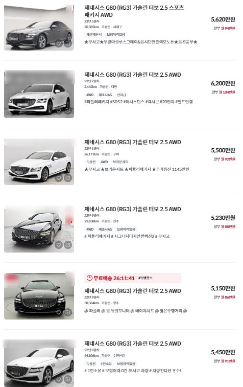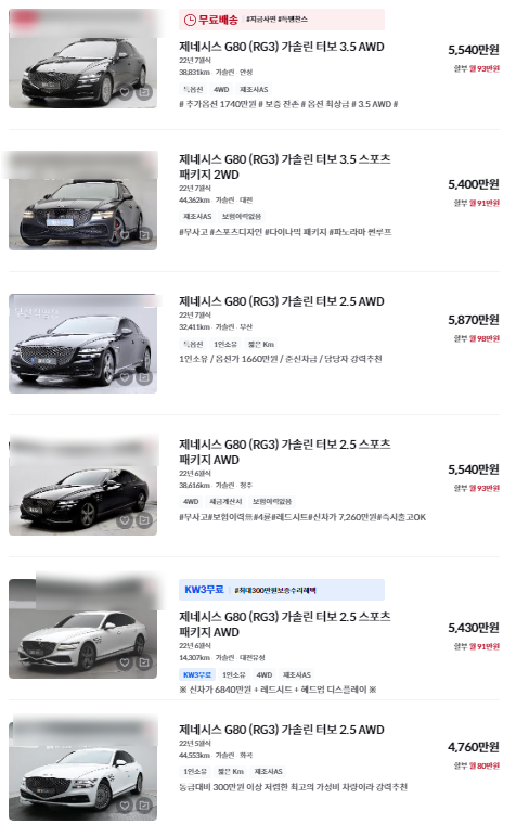 | G80 (RG3) 실매물 🌟🌟🌟 | 5,500 ~ 6,200 | 2023년식 |